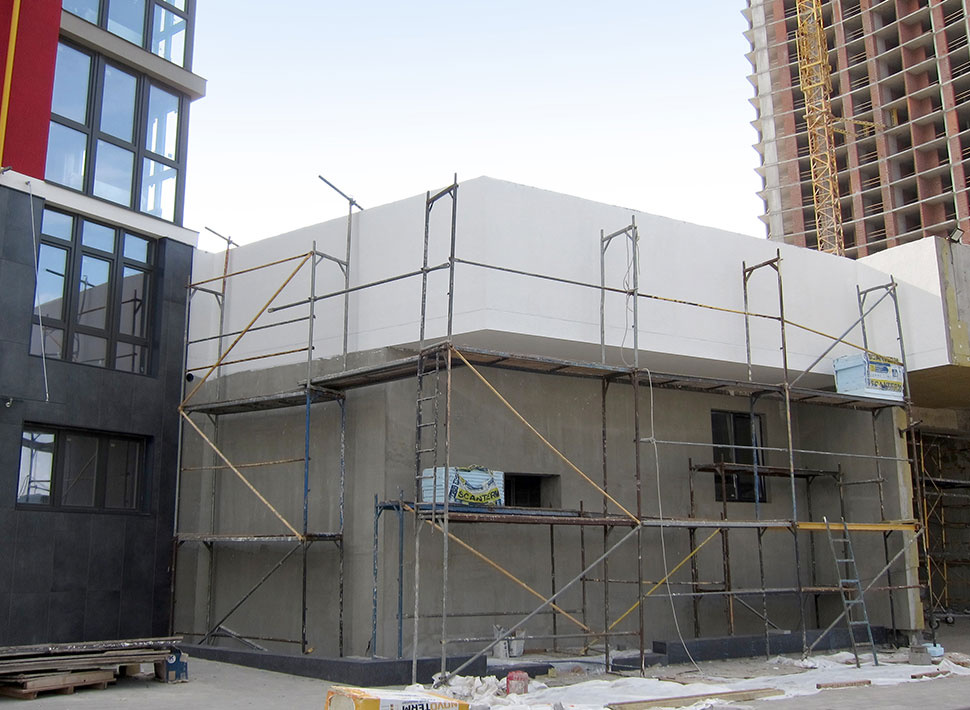 ![]() | Стіни зовнішні: з керамзитобетонних блоків товщиною 250 мм на клейовому розчині та залізобетонні, із зовнішнім ефективним утеплювачем і оздобленням |